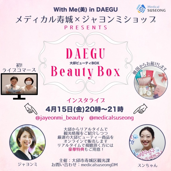 수성구와 경산시의 대표 의료·뷰티제품으로 구성된 대구뷰티박스(5000엔)를 소개하면서 실시간으로 판매하는 라이브커머스 형태로 진행된다.