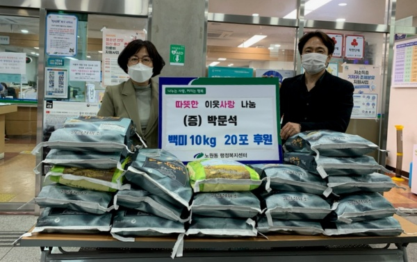 | ↑↑ 지역주민 박문석씨, 노원동 행정복지센터에 백미 20포 기탁 |