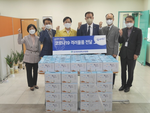 대구한의대의료원(의료원장 변준석)은 지난 12일, 코로나19로 고생하는 보건소 직원들의 면역증진을 위해 한의대의료원에서 직접 만든 한약 50박스를 전달하고 직원들을 격려했다.