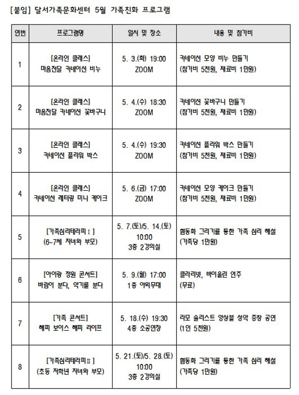 (재)달서문화재단 달서가족문화센터가 5월 가정의 달을 맞아 다양한 가족친화 프로그램을 선보인다.