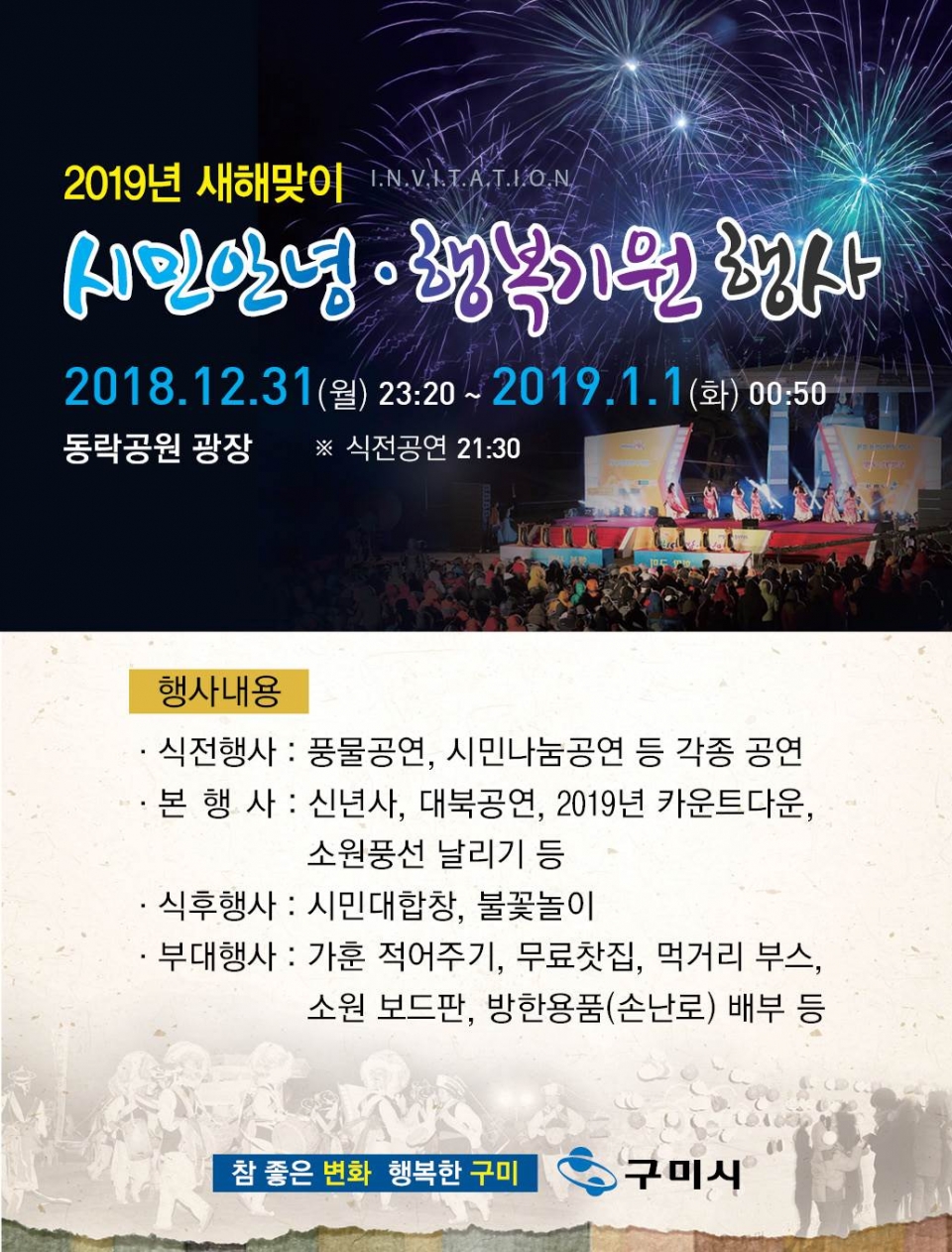 구미시(시장 장세용)는 오는 31일(월) 23:20(식전공연 21:30)부터 동락공원 광장에서 시민들과 함께하는'2019 새해맞이 시민 안녕?행복 기원행사'를 개최해 무술(戊戌)년 한 해를 보내는 아쉬움을 뒤로하고, 기해(己亥)년 새해 구미발전과 시민 안녕을 기원하는 축제장을 마련할 예정이다.