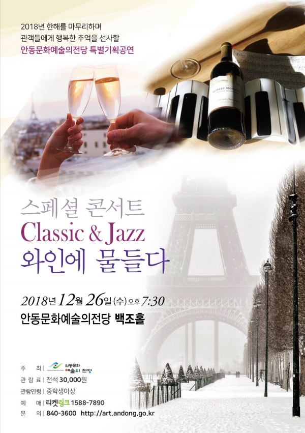 올해를 마무리하며 관객들에게 행복한 추억을 선사할 스페셜 콘서트 ‘Jazz & Classic 와인에 물들다’가 26일(수) 저녁 7시30분 안동문화예술의전당 백조홀에서 진행한다.