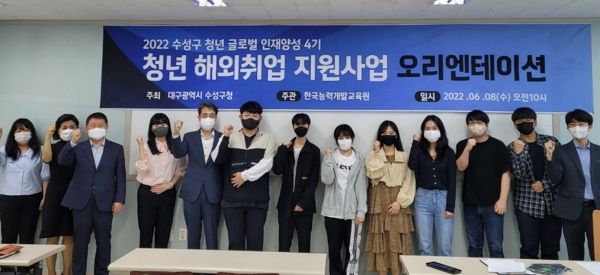 지난 5월 수성구청은 1차 서류접수와 2차 면접심사를 거쳐 일본 취업희망 미취업청년 8명을 최종 선발하고 지난 8일에 수탁기관인 ㈜한국능력개발교육원에서 오리엔테이션도 실시했다.