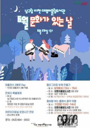 대구광역시 남구청(구청장 조재구)은 6월 문화가 오는 날을 맞이하여 구립도서관에서 주민들을 위한 다양한 행사를 제공할 예정이라고 15일 밝혔다.