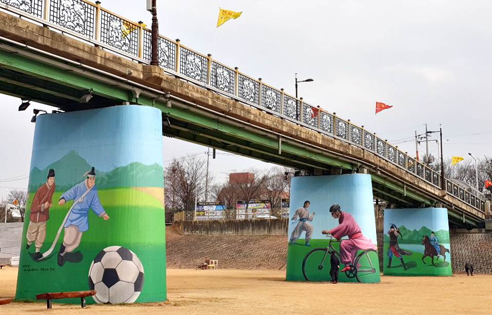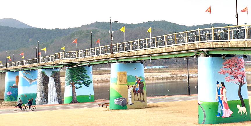 이에 시는 하천과 인접한 교각 3면에는 형산강의 자연경관에 어울리는 왜가리, 황포돛대, 폭포 벽화를 그리고, 자전거도로와 산책로가 접한 둔치의 교각 6면은 김유신 장군과 관련된 역사 기록과 화랑의 모습을 천년고도 경주의 이미지에 맞게 현대화하여 축구와 활쏘기, 말타기하는 모습으로 표현했으며, 황룡사 금당벽화로 유명한 솔거의 노송도도 작업했다.