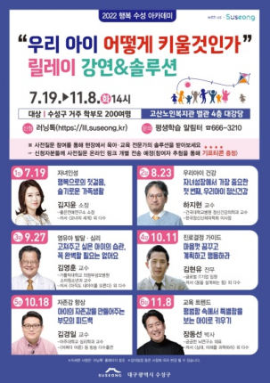 대구 수성구는 7월 19일부터 11월 8일까지 총 6회에 걸쳐 고산노인복지관 별관 대강당에서 수성구·경산 거주 학부모 200여 명을 대상으로 ‘2022 행복 수성 아카데미’를 운영한다.