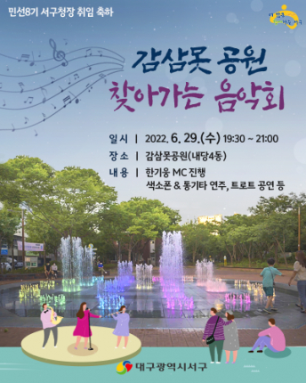 대구 서구청(구청장 류한국)은 오는 29일 오후 7시 30분부터 감삼못 공원(내당4동 소재)에서 ‘찾아가는 음악회’를 개최한다.