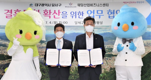 대구 달서구(구청장 이태훈)는 4일 구청 회의실에서 웨딩산업 비즈니스센터(센터장 김종식)와 초저출산 대응과 결혼문화 확산을 위한 업무 협약을 체결했다고 밝혔다.