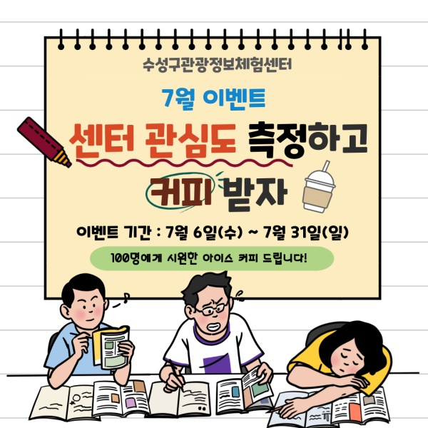 대구 수성구관광정보체험센터는 7월을 맞이해 시민들을 대상으로 수성구의 관광 이미지를 제고하고 센터 홍보를 위한 온라인 이벤트를 한 달 간 진행할 예정이라고 6일 밝혔다.