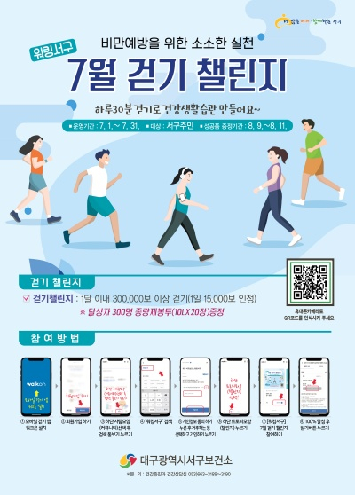 대구서구보건소는 구민의 신체활동을 증진시키기 위해 스마트폰을 활용한 ‘워킹! 서구’ 걷기 챌린지를 7월부터 11월까지 매월 운영한다고 밝혔다.