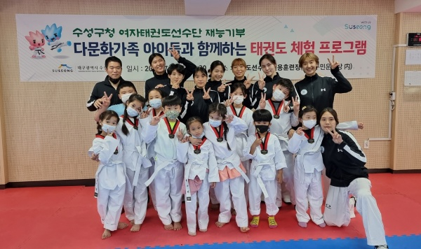 대구 수성구청(구청장 김대권) 여자태권도선수단은 지난 9일 수성구민운동장에 위치한 선수단 훈련장에서 다문화가족 아이들을 대상으로 태권도 재능기부를 했다.