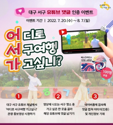 대구 서구청(구청장 류한국)은 서구 관광자원과 서구청 공식 유튜브 채널 홍보를 위해 8월 7일까지 서구 관광명소를 주제로 ‘어디가(어디로 서구 여행 가고 싶니)’유튜브 시청 인증 이벤트를 실시한다.