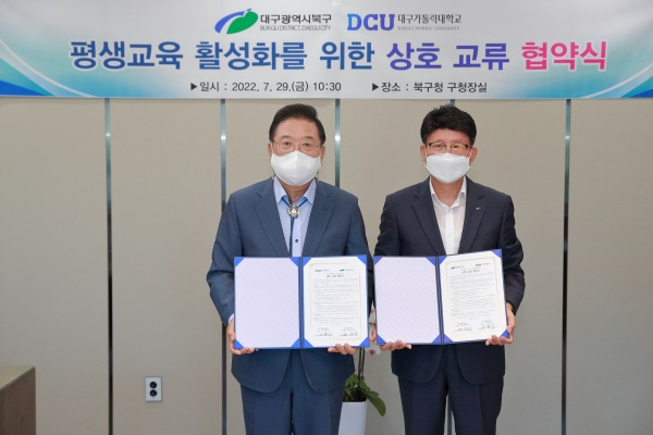 대구 북구청(청장 배광식)은 7월 29일(금) 대구가톨릭대학교 유스티노자유대학과 북구민의 평생학습 실현 및 지방자치 행정에 헌신할 우수한 인재 육성으로 지역사회 발전에 기여하기 위한 협약을 체결하였다.