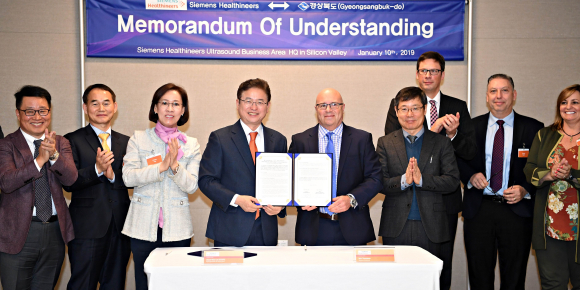 경북도와 지멘스헬스니어스는 10일(현지시간) 오전 미국 실리콘밸리에 소재한 지멘스 헬시니어스의 초음파 진단기 사업본부에서 경북도내 투자확대를 위한 MOU를 체결했다.