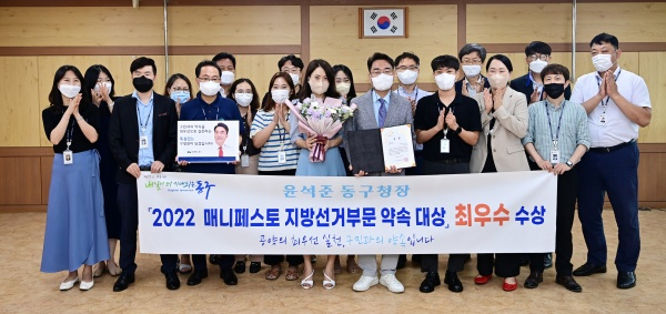 윤석준 대구 동구청장이 한국매니페스토실천본부가 주최한 지방선거부문 ‘2022 매니페스토 약속대상’ 선거공보 분야에서 최우수상을 받았다.