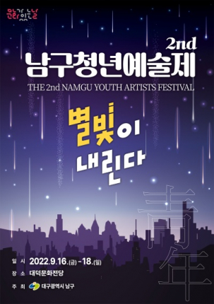 한편, 오는 9월 16일부터 18일까지 대덕문화전당에서 열리는 ‘2022 남구 청년 예술제’는 대구시 청년주간에 동시에 개최되어 지역에서 활동하는 청년예술가들의 공연 이외에 참여 청년예술가들의 음반이나 소개자료들을 볼 수 있는 전시회도 함께 열려 관객이 공연을 감상하며 청년예술가와 소통하고 응원하면서 예술제 전 과정을 즐기면서 참여할 수 있다.