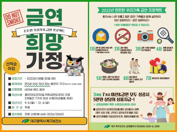 대구 북구보건소(소장 이영숙)는 몇번의 금연 실패로 의지가 약해진 흡연자들을 발굴하여 금연 성공률을 높이고자 가족과 함께하는 ‘든든한 우리 가족 금연 프로그램’을 운영한다.