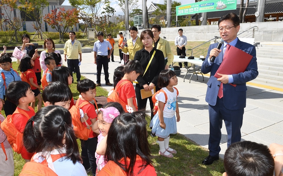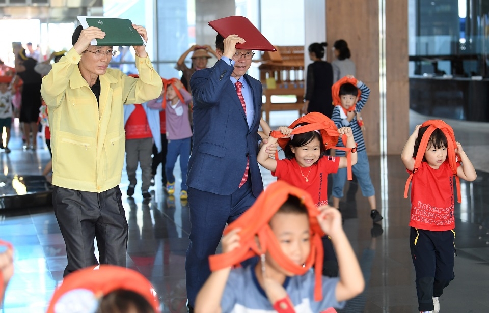 이번 지진대피 훈련은 「2018년 지진안전주간」기간 중 전국단위 훈련으로 도청, 도의회 및 도청어린이집, 시군 및 교육청, 각급 학교(초?중?고?특수)와 민간기관에서도 동시에 실시했다. 14시 정각에 지진 상황이 발령되자 도청 직원들과 도청 어린이집 교사 및 원생들은 몸을 보호하기 위해 책상이나 탁자 아래로 대피한 후, 지진매뉴얼에 따라 옥외 대피장소로 지정된 새마을광장으로 대피했다.