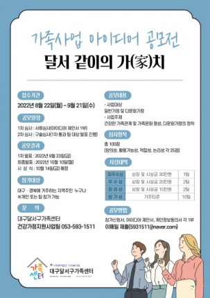 대구 달서구(구청장 이태훈)는 9월 21일까지 대구달서구가족센터(관장 원준호)에서 건강한 가족관계 형성을 주제로 ‘가족사업 아이디어 공모전’을 개최한다고 밝혔다.