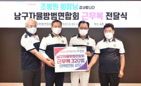 조영원 회장은 “남구의 치안을 위해 활발한 활동을 하고 있는 자율방범연합회원들을 위해 조금이나마 보탬을 주고자 근무복을 후원하게 되었고, 앞으로도 더욱 살기좋은 남구를 위해 힘써 줄 것”을 당부했다.