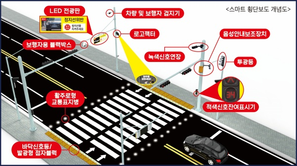 스마트횡단보도는 보행자와 차량을 감지해 ▲보행자 유무 ▲무단횡단 ▲과속 ▲정지선 위반 ▲불법 주정차 금지 등 교통 상황에 대한 안내 및 계도를 하는 시스템이다. 운전자에게는 영상 및 문구를 통해 LED 전광판을 통해 알려주며, 보행자는 횡단보도에서 음성 안내 보조 장치를 통해 알려주게 된다.
