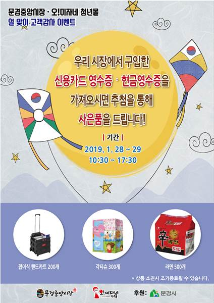 오는 28일과 29일 양일간 문경중앙시장 주차타워 입구에서 개최되는 설맞이 고객 감사 이벤트는 전통시장을 이용하는 고객들의 결제편의를 돕기 위해 신용카드 가맹률을 높이고자 하는 취지로 마련되었으며, 문경중앙시장과 오!미자네 청년몰에서 구입한 상품에 대한 1만 원 이상의 신용카드 영수증이나 현금영수증을 가져오면 즉석추첨을 통해 접이식 쇼핑카트, 각티슈, 라면 멀티팩 등의 다양한 사은품을 소진 시까지 제공할 계획이다.