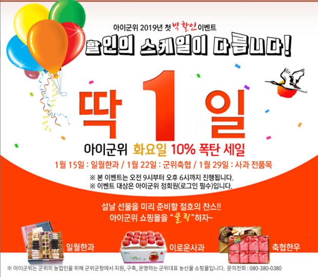 경북 군위군 대표 농.특산물 쇼핑몰인 '아이군위'(igunwi)는 민족 최대 명절인 설을 맞아 오는 1월 15일, 1월 22일, 1월 29일까지(3일간) 특별할인 이벤트 행사를 마련한다. 군에 따르면 이번 이벤트는 아이 군위 화요일 10% 할인한다.