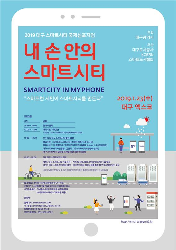 대구시는 오는 23일(수) 10시, 엑스코에서 'Smart City in My Phone-내 손안의 스마트시티'라는 주제로 ‘2019 대구 스마트시티 국제심포지엄’을 개최한다.