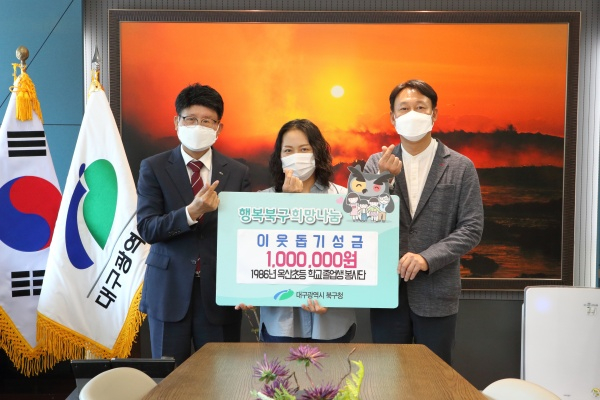 1986년 옥산초등학교 졸업생 봉사단(단장 최서현)은 9월 14일(수) 관내 저소득 청소년을 위해 써달라며 성금 100만원을 대구 북구청(청장 배광식)에 기탁했다.