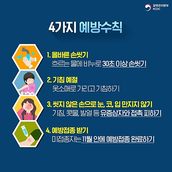흔히 독감이라고 불리는 인플루엔자는 감기와는 다르게 38℃ 이상의 고열과 기침 또는 인후통 등의 호흡기 증상을 동반하며, 의심증상이 있는 경우 가까운 의료기관에서 신속하게 진료를 받아야 한다. 또한 국가예방접종대상자 외 임신부, 만성질환자 등의 고위험군, 그리고 일반 성인까지도 예방접종을 받을 것을 권고하고 있다.