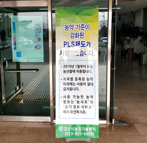 농약허용물질목록관리제도(PLS : Positive List System)가 2019년 1월 1일부터 시행됨에 따라 경산시 농업기술센터(소장 김종대)에서는 읍면동 주요 지역에 현수막을 게첩하고 읍면동행정복지센터 현관에 배너를 비치하고 새해농업인 실용교육 시 홍보교육을 하는 등 농업인에게 홍보에 철저를 기해 농가의 피해가 없도록 하는데 최선을 다하고 있다.