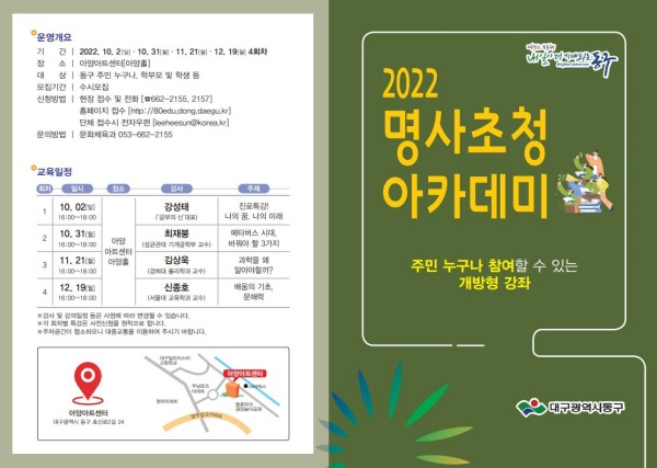 대구 동구청(구청장 윤석준)이 지역 평생학습 활성화를 위해 ‘명사초청 아카데미’를 진행한다.