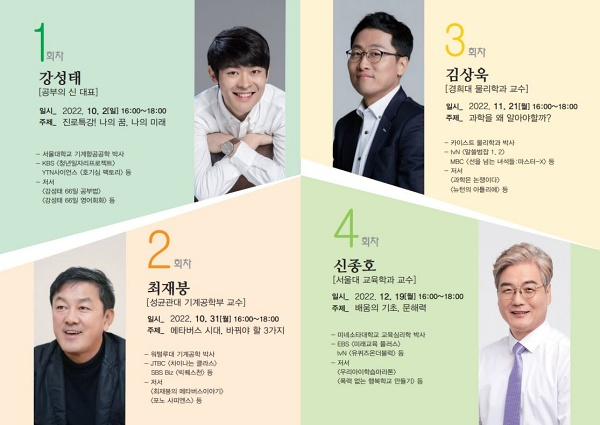 오는 10월2일에는 개강과 함께 공부의 신 강성태씨가 연단에 올라 ‘진로특강! 나의 꿈, 나의 미래’ 주제로 강의를 한다. 이어 최재붕 교수의 ‘메타버스 시대, 바꿔야 할 3가지’(10월31일), 김상욱 교수의 ‘과학을 왜 알아야할까?’(11월21일), 신종호 교수의 ‘배움의 기초, 문해력’(12월19일)이 진행된다. 강의는 아양아트센터에서 열리며, 매회 오후4시다.