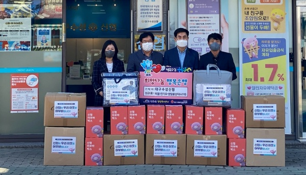 | ↑↑ 대구수성신협(이사장 박훤태)은 지난 30일 취약계층의 따뜻한 겨울나기를 위한 전기장판, 이불 등 난방용품 21개와 생필품을 담은 어부바박스 20개를 만촌3동 행정복지센터에 전달 후 기념 촬영하고 있다. |
