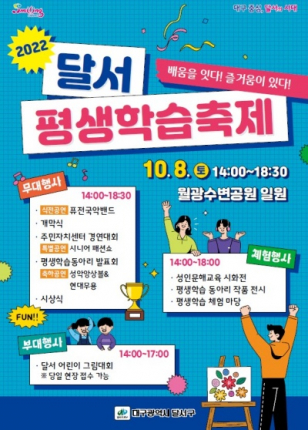 대구 달서구(구청장 이태훈)는 8일 오후2시 월광수변공원에서 ‘배움을 잇다! 즐거움이 있다!’는 슬로건으로 2022 달서평생학습축제를 개최한다.