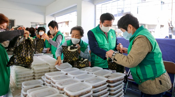어려운 이웃을 위한 밑반찬을 만들어 전달하는 ‘사랑의 맛바구니’ 행사에는 새마을협의회·부녀회 회원 35여명이 참여해, 코로나19 장기화로 어려움을 겪는 독거노인, 장애인 가구 등 120가구에 반찬을 전달할 예정이다.
