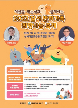 대구 달서구(구청장 이태훈)는 10월 22일(토) 성서아울렛타운 내에 위치한 성서아울렛공원(호림동 13-11번지)에서 ‘2022 달서 반려가족 희망나눔 축제’를 개최한다고 밝혔다.