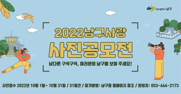 대구광역시 남구청은 남구의 관광자원, 축제, 문화행사 등 남구의 다양한 매력을 알리기 위해 「2022 남구사랑 사진공모전」을 개최한다고 20일 밝혔다.