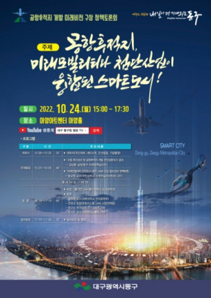 대구 동구청(구청장 윤석준)은 오는 24일 오후3시, 아양아트센터 아양홀에서 ‘공항후적지, 미래모빌리티와 첨단산업이 융합된 스마트 도시!’를 주제로 전문가 정책토론회를 개최한다.