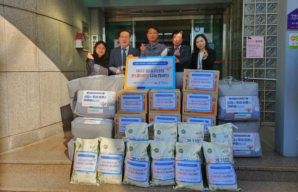 동대구신협(이사장 김한수)은 10. 26.(수) 오전 10시 동인동행정복지센터를 방문하여 2022년 동대구신협 “온세상 나눔캠패인” 실시의 일환으로 이웃돕기 성품(이불 23채, 라면 10box, 백미 10kg 10포-150만원 상당)을 전달하였다.