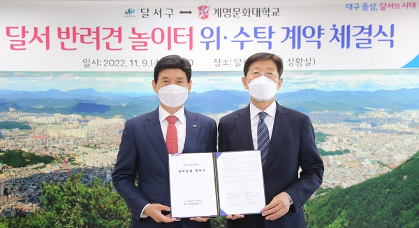 대구 달서구(구청장 이태훈)는 9일 구청 5층 회의실에서 계명문화대학교(총장 박승호)와 달서 반려견 놀이터 위·수탁 계약 체결식을 가졌다고 밝혔다.