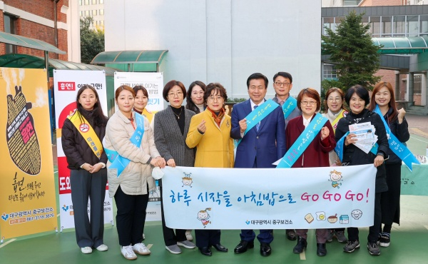 대구 중구(구청장 류규하)는 ‘건강한 우리학교 만들기’ 사업의 일환으로 지난 9일 오전 경북대학교사범대학부설중학교(이하 사대부중)에서 ‘하루 시작을 아침밥으로 GoGoGo’를 주제로 아침 결식예방 캠페인을 실시했다.
