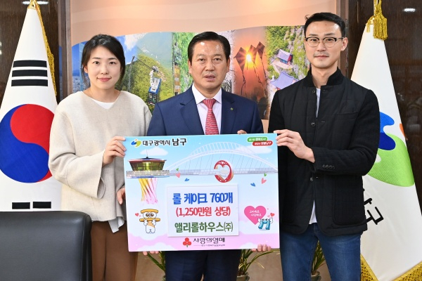 대구광역시 남구청(구청장 조재구)은 지난 10일, 앨리롤하우스㈜(대표 남호훈, 박희진)에서 빼빼로데이를 맞아 취약계층 아동들에게 전달해 달라며 1,250만원 상당의 빼빼로 모양 롤케이크 760개를 기탁했다고 밝혔다.