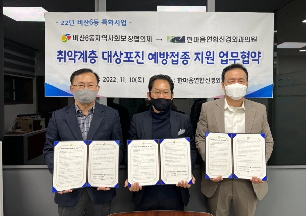 대구 서구 비산6동 지역사회보장협의체(공동위원장 전진우, 김성대)와 한마음연합신경외과의원(원장 류강제)은 10일 오후 취약계층 26세대에 대한 대상포진 예방접종 지원을 위한 업무협약을 체결했다.