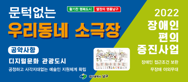 특히 이번 대구광역시 남구가 추진한 ‘2022 장애인 편의증진 사업 문턱없는 우리동네 소극장’은 장애인 및 사회적 약자들의 접근이 상대적으로 어려웠던 소극장에 장애인 편의시설이 개선됨으로써 단순 시설 개선의 기능을 넘어 소극장이 남녀노소, 장애, 비장애에 상관없이 누구나 문화 향유를 즐길 수 있고 접근성의 확대로 문화예술인들과 장애인들의 소통 장소가 될 수 있다는 것에서 그 의미가 크다.