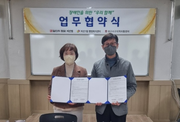 대구광역시 서구 비산1동 행정복지센터(동장 김희자)가 대구서구지역자활센터(센터장 최종수)와 코로나 19로 어려움을 겪고 있는 서구 관내 장애인의 복지증진과 자활근로사업단의 자립지원을 위해 11월 10일 「우리 함께」사업 업무협약(MOU)를 체결했다.
