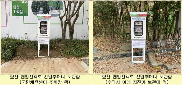 앞산 맨발산책로에 설치된 신발주머니 보관함의 신발주머니는 맨발산책로 이용객들 누구나 사용할 수 있고 맨발산책로를 이용한 후 산책로 양 끝에 있는 보관함에 다시 넣기만 하면 된다.