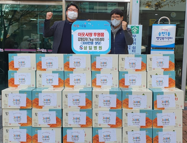 심태희 송현1동장은 “2021년에 이어 올해에도 어려운 시기 나눔으로 함께 해준 삼일병원에 감사드리며, 전해주신 김장김치는 코로나 19 및 겨울철 어려운 시기를 보낼 이웃들에게 잘 전달되도록 하겠다.”라고 말했다.