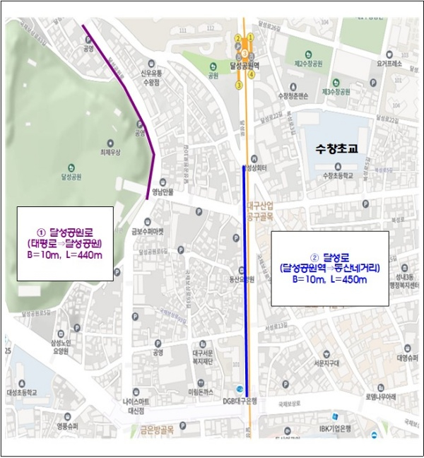 이번 공사 구간은 달성공원로 및 달성로 중 노면상태가 좋지 않은 달성공원로(태평로→달성공원 입구) 440m 구간(24일21:00~25일06:00)과 달성로(달성공원역→동산네거리) 450m 구간(25일21:00~26일06:00)이며, 시민들의 교통불편을 최소화하기 위해 차량 통행량이 적은 야간시간대(오후9시~오전6시)에 공사할 계획이다.