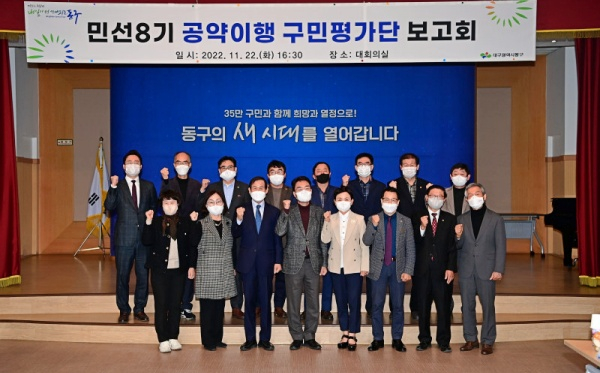 대구 동구청(구청장 윤석준)은 지난 22일, 민주적이고 투명한 참된 공약을 실천하고자 민선8기 구청장 공약이행 구민평가단 위촉식 및 공약 확정 보고회를 개최했다.